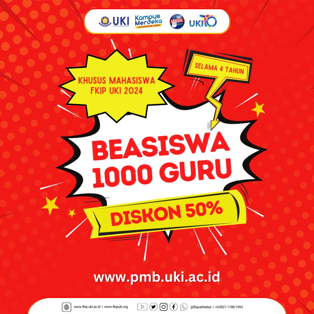 UKI masih membuka pendaftaran untuk beasiswa Seribu Guru. Dapatkan potongan biaya kuliah hingga 50% hingga lulus. Beasiswa ini disediakan khusus untuk prodi-prodi pendidikan di UKI.