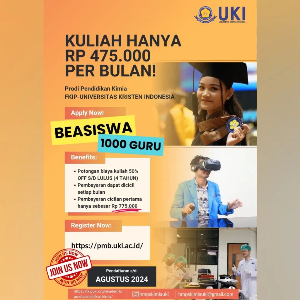 www.pmb.uki.ac.id JAKARTA (07/05/2024) Beasiswa 1000 Guru Panggilan untuk semua calon pendidik kimia! 🚨🚨🚨 Gali potensi Kamu dengan kuliah di Universitas Kristen Indonesia melalui BEASISWA 1000 GURU! 🎓Dapatkan DISKON 50% OFF untuk biaya sekolah HINGGA LULUS (4 tahun) dan buka jalan menuju masa depan yang lebih cerah dalam Pendidikan Kimia. Jangan lewatkan kesempatan luar biasa ini