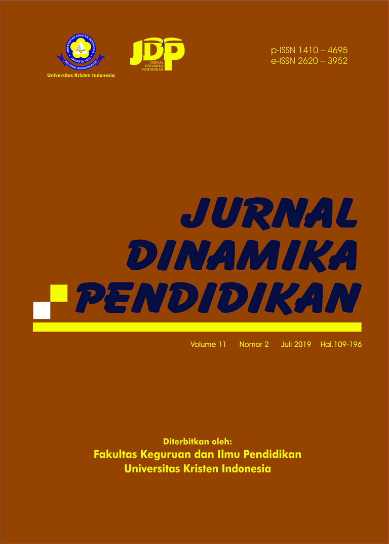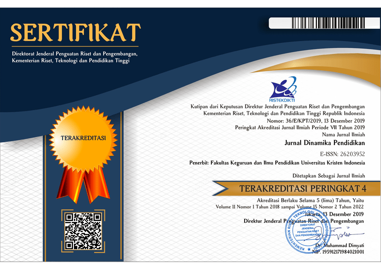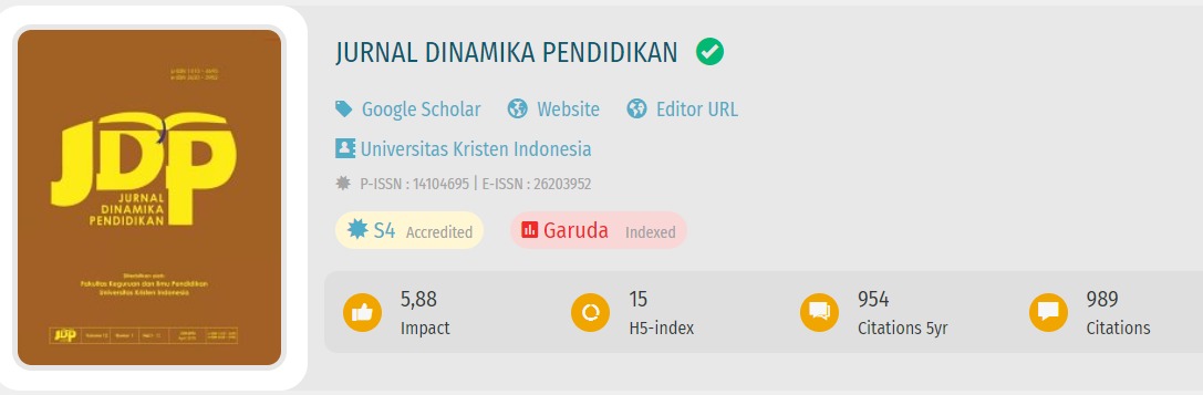 Jurnal Dinamika Pendidikan focused to publish high-quality articles dedicated to all aspects of the latest outstanding research and developments in the fields of Education.This journal with registered number p-ISSN : 1410-4695 and e-ISSN 2620 3952 is a scientific journal which published by Fakultas Keguruan dan Ilmu Pendidikan, Universitas Kristen Indonesia that covered about teaching and learning on educational settings. The aims of Jurnal Dinamika Pendidikan is to disseminate the conceptual thoughts and ideas or research results that have been achieved in the area of education.